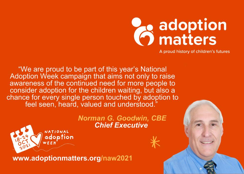 Adoption Matters Chief Executive, Norman G. Goodwin, CBE, who is a member of the National Adoption Recruitment Steering Group, said: “Adoption Matters have placed many thousands of children for adoption with our families in our 74+ year history. We know that this has an incredibly rewarding experience for many of these children and families, as Jamie’s comments above clearly show. However, we understand the complexities of adoption and the lives it affects. That’s why in addition to the continued support we offer to our families, children and adopted adults, we have always offered support to birth families involved historically with our agency, a service that is free of charge to those families and funded by our charity. We are proud to be part of this year’s National Adoption Week campaign that aims not only to raise awareness of the continued need for more people to consider adoption for the children waiting, but also a chance for every single person touched by adoption to feel seen, heard, valued and understood.”